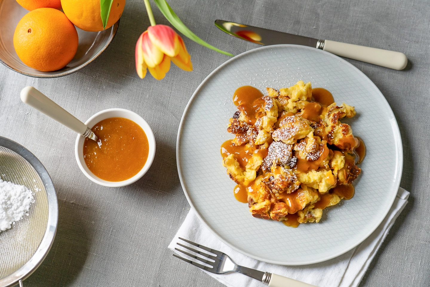 A gyömbértől különleges narancsszósz izgalmassá teszi a lágy, de mégis pirult tésztájú, hagyományos császármorzsát is.