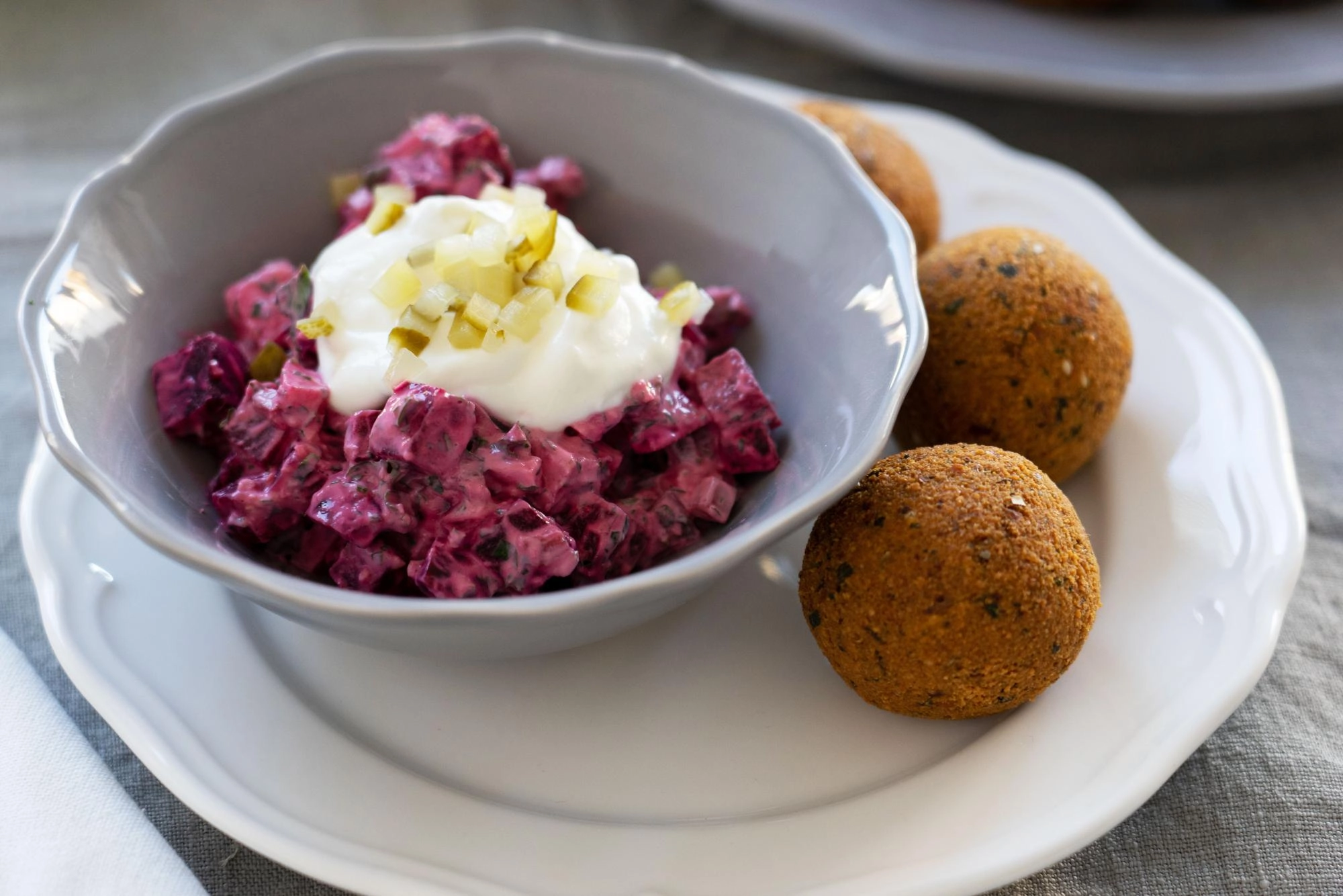 A szürke februári napokat színes ételekkel is feldobhatjuk: a céklasaláta és a csicseriborsó fasírt jól mutat együtt a tányéron