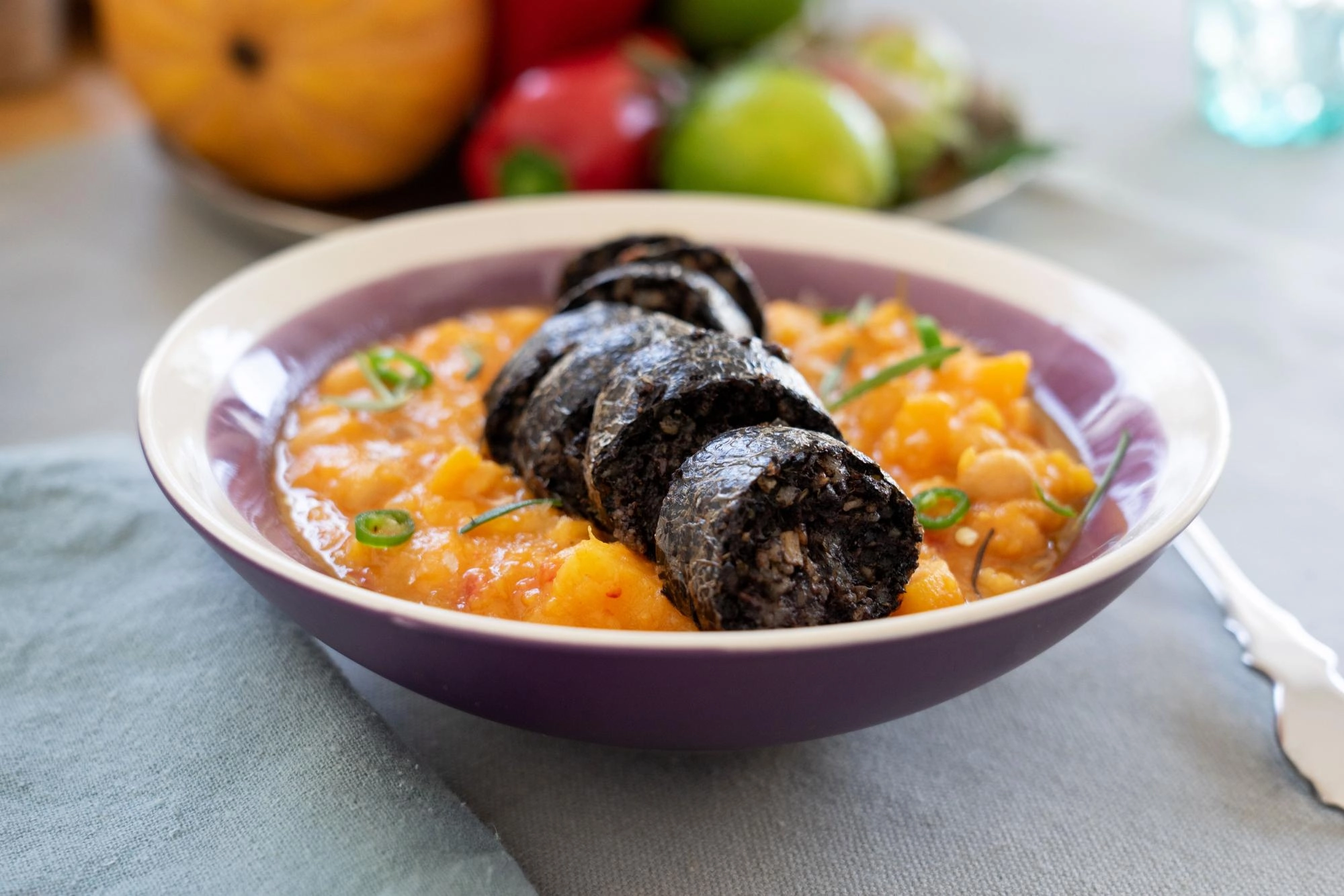 Édesburgonyából és csicseriborsóból igazán könnyű, mégis tápláló főzeléket készíthettek, és pár szelet hurkával még fel is dobhatjátok.