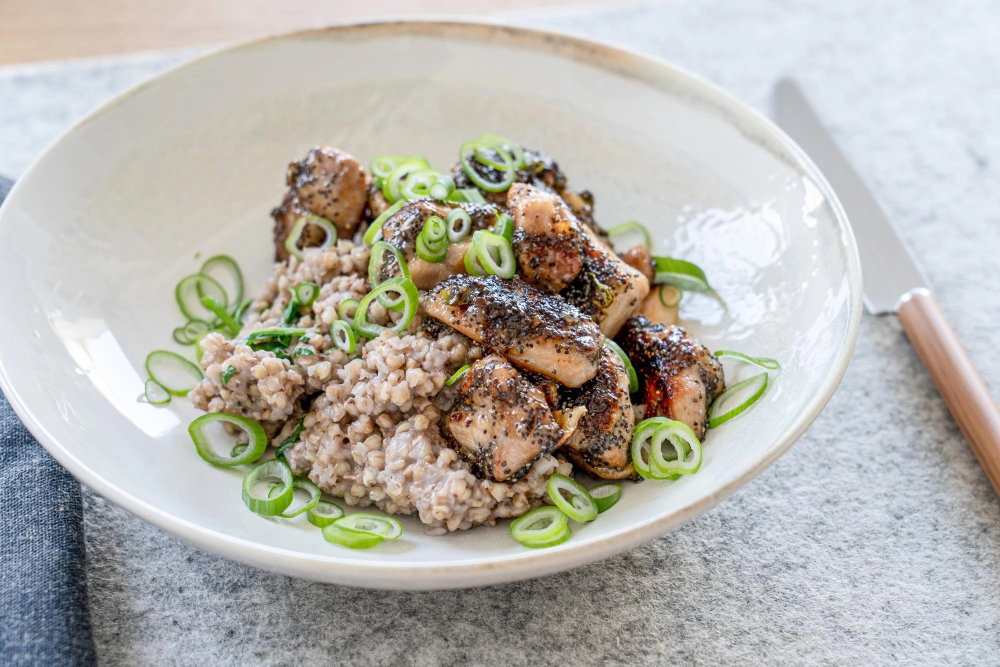 - Keverjétek össze a mosott bébispenóttal és vékonyra szelt újhagymával a hajdinát, majd tálaljátok a mákos csirkével.