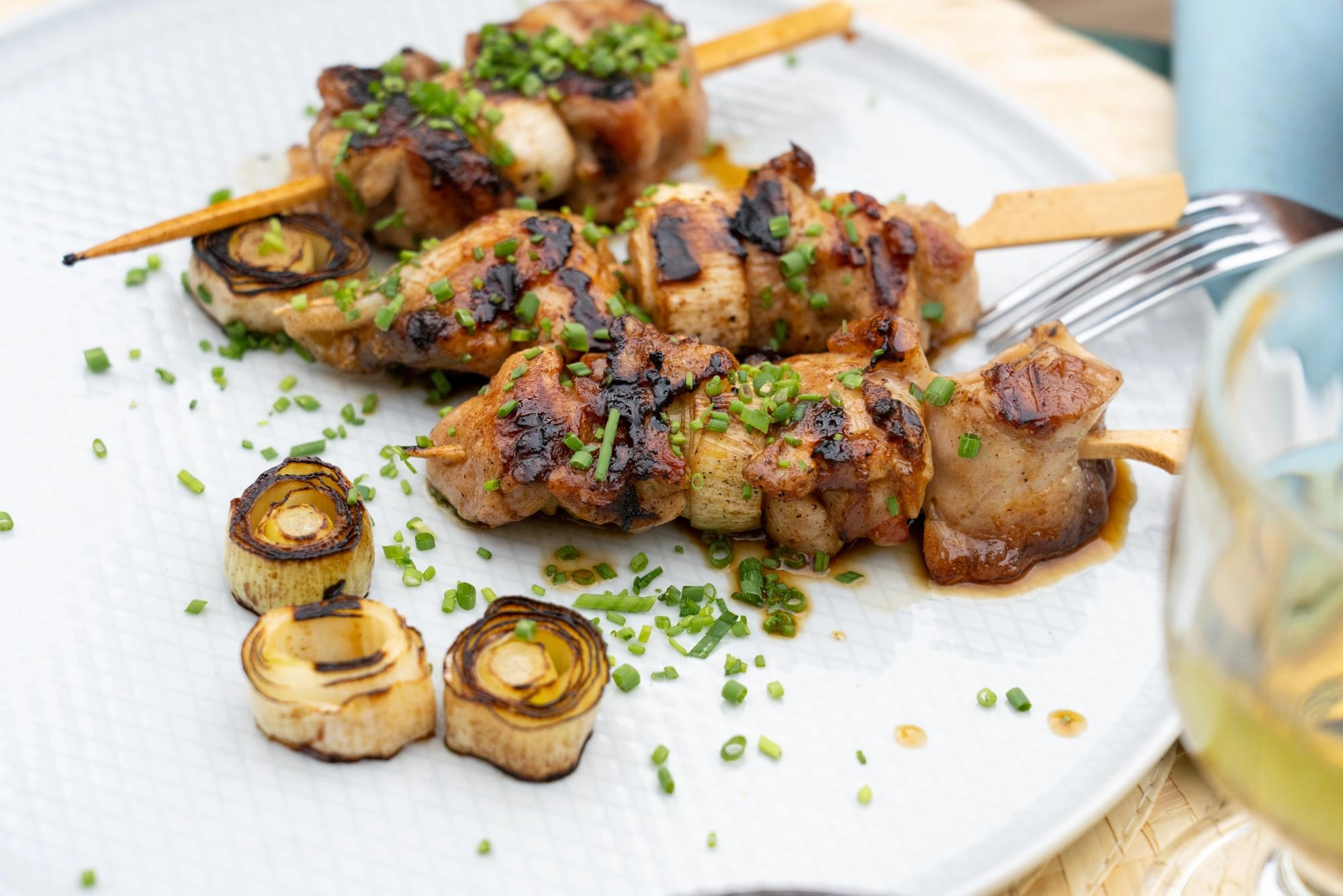 - Húzzátok nyársra a bepácolt csirkecomb darabokat úgy, hogy két csirkecomb közé mindig kerüljön a nyársra egy póréhagyma is.