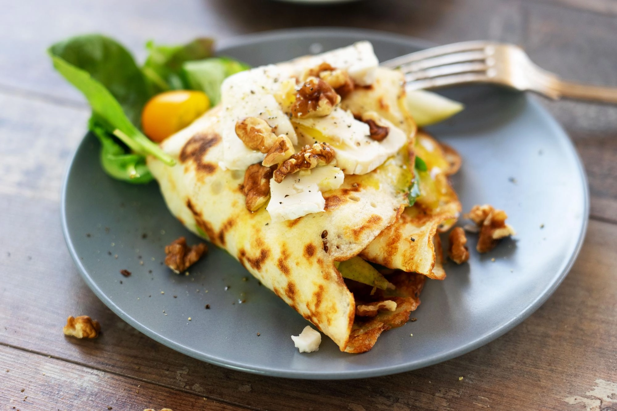 Diós-kecskesajtos palacsinta körtével és rukkolával