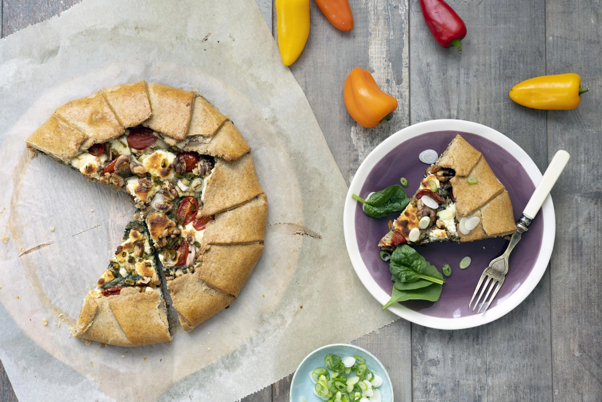 - Helyezzétek a tölteléket a tészta közepére. Adjátok hozzá a maradék diót, újhagymát, félbevágott koktélparadicsomokat. Hajtsátok vissza a töltelékre a lelógó tésztát, enyhén tapasszátok össze a széleket, majd kenjétek le kevés vízzel elkevert tojással.
