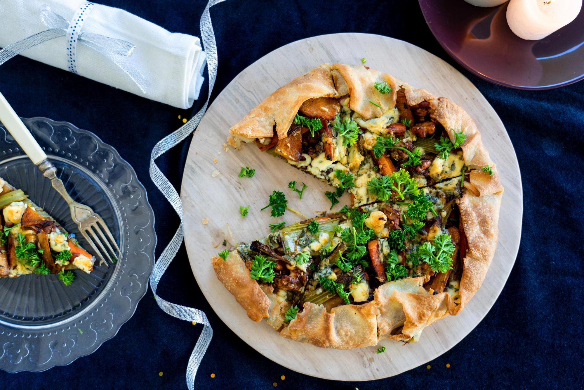 - Halmozzátok az elősütött zöldségeket a tészta közepére, hogy minden oldalról maradjon 10 cm-nyi tészta rész. Morzsoljátok rá a kéksajtot, hintsétek meg dióval, szükség esetén sózzátok-borsozzátok. Hajtsátok fel a maradék tésztát, hogy ropogósra süljön majd a tészta széle. Tegyétek az előmelegített sütőbe, és 20-24 perc alatt süssétek készre. Akkor lesz jó, ha a sajt már elolvad, a tészta széle pedig aranybarna és roppanós lesz.