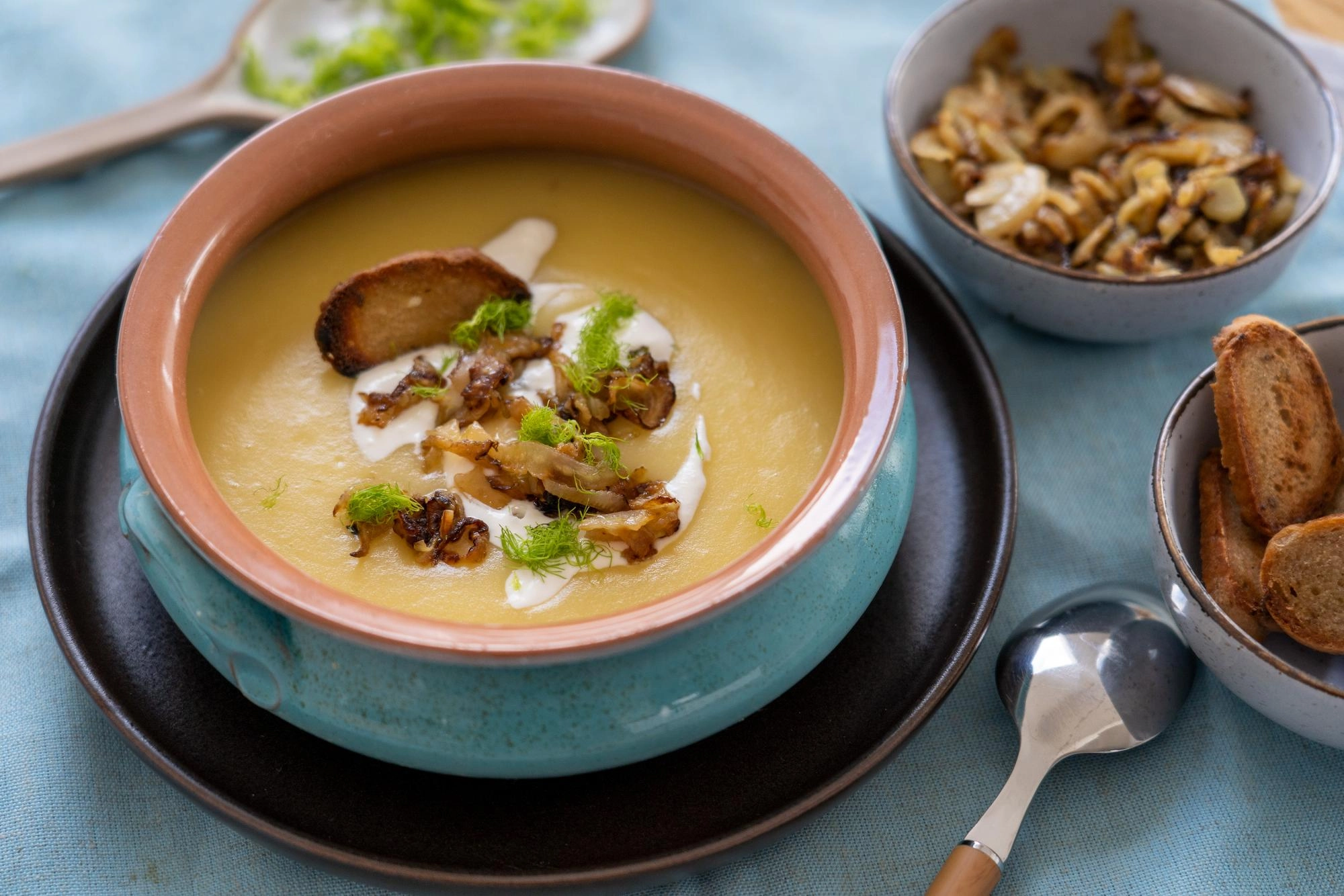 - Tálaljátok forrón a levest kevés krémesre kevert tejföllel, vékony szelet pirítóssal, és a pirított édesköménnyel.