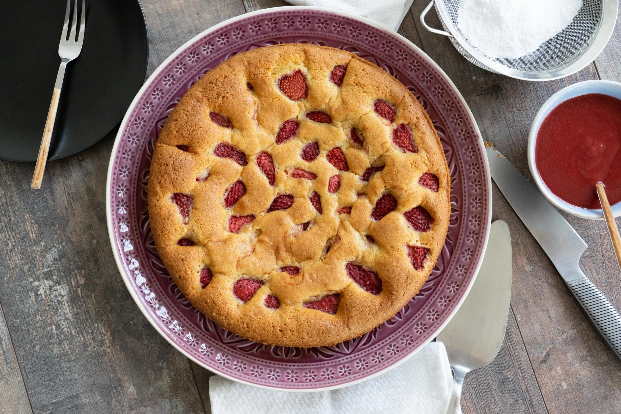- Egy kapcsos tortaformát vékonyan kenjünk ki étolajjal, majd öntsük a híg tésztát a formába. Finoman pakoljuk meg a torta tetejét a félbevágott eprekkel, a vágásfelülettel felfelé. Tegyük az előmelegített sütőbe, majd 40-45 perc alatt süssük készre. Tűpróbával ellenőrizzük, hogy elkészült-e!