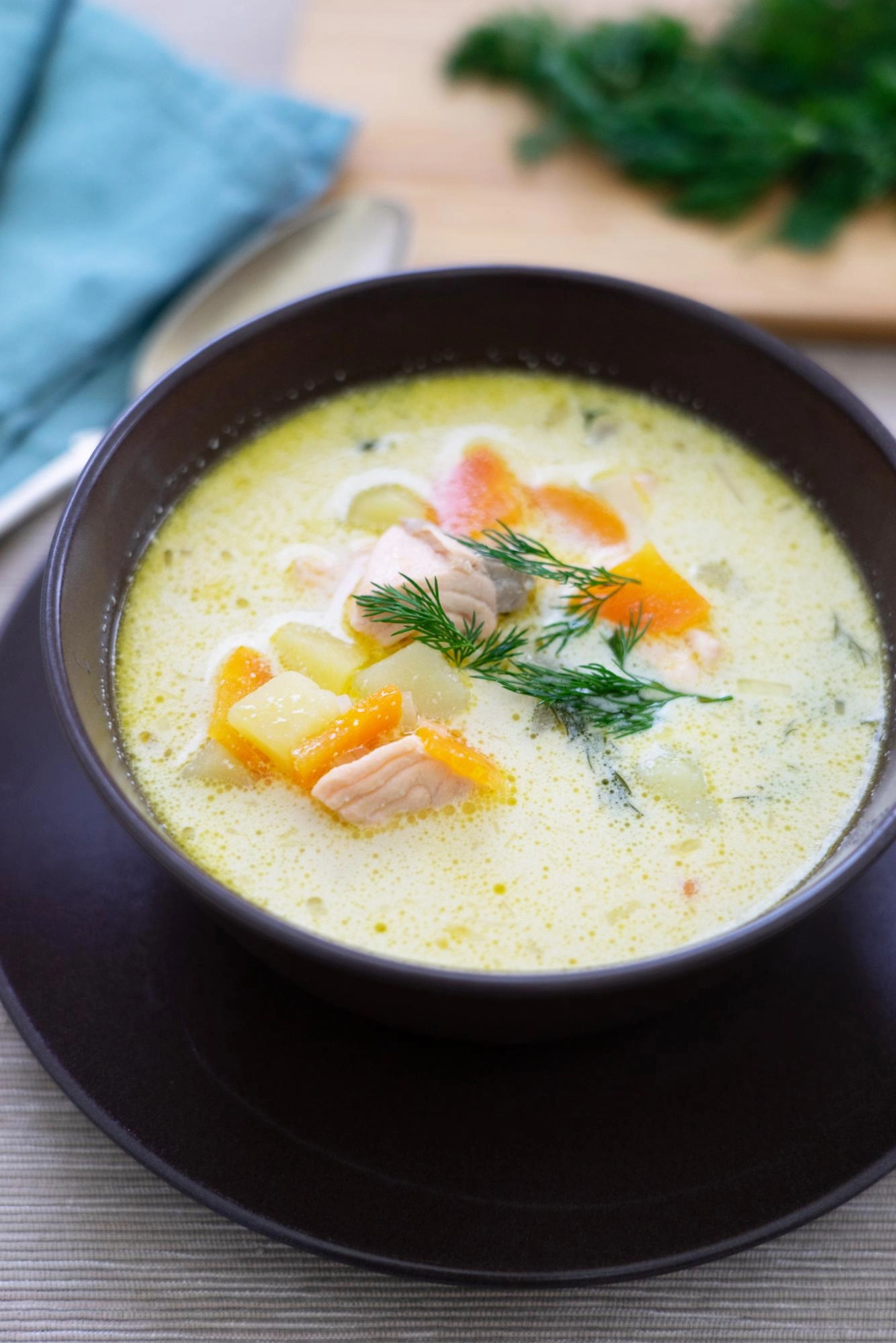 - Éles késsel távolítsuk el a lazac bőrét. Szeljük a halat 3-4 centis darabokra, majd tegyük a leveshez. Főzzük 5-10 percig, aztán el is zárhatjuk. Tálaljuk forrón, friss kaporral!