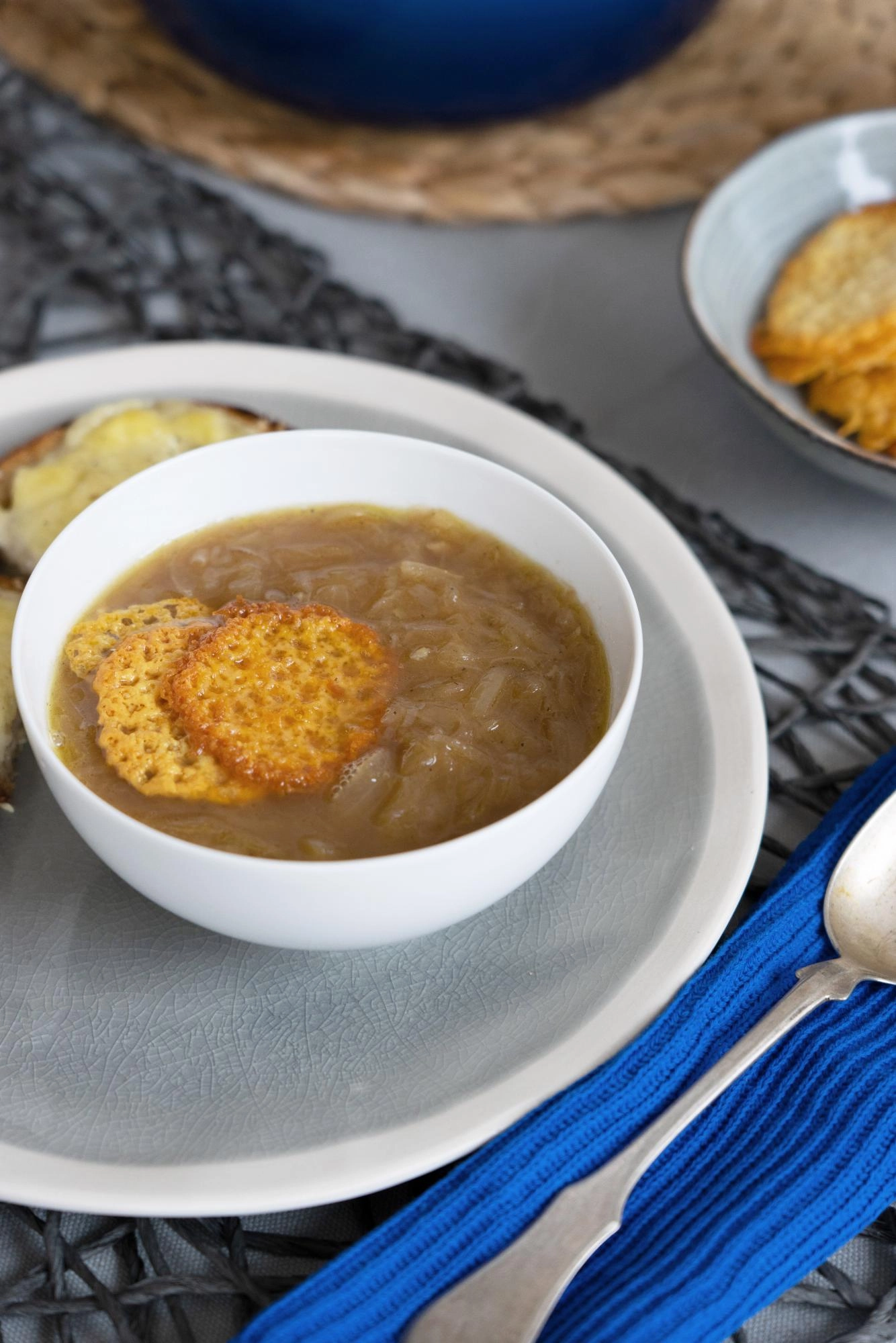 - Amíg a leves készül, készítsünk sajtchipszet! Reszeljünk cheddar vagy gruyere sajtot, majd halmozzunk belőle kis kupacokat egy sütőpapírra. 220 fokra előmelegített sütőben 3-4 perc alatt elkészül!