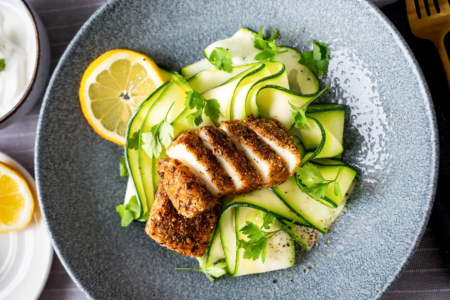 - Tálaljátok a bundázott halloumit a nyers cukkinivel és pár csepp citrommal.
