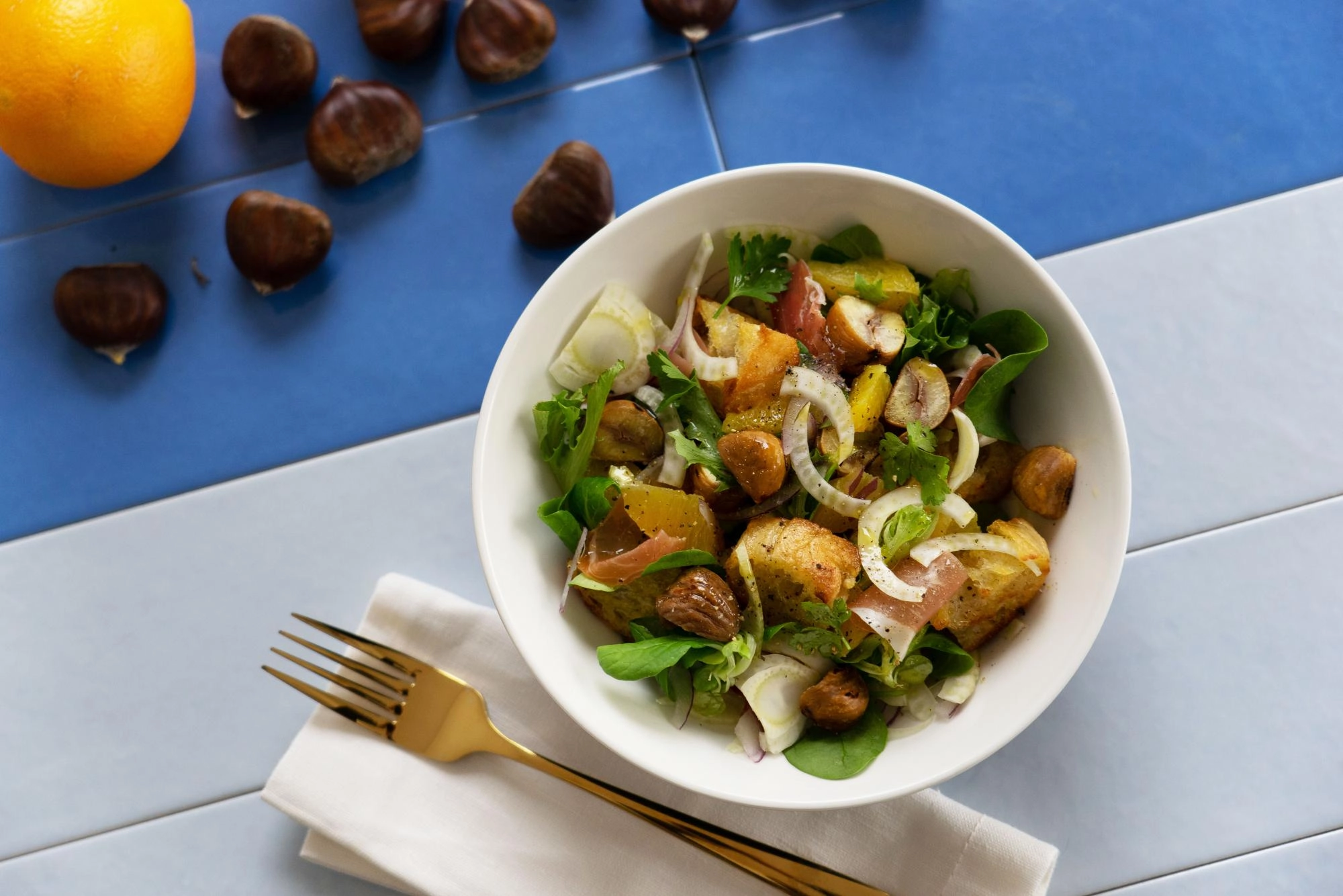 Gesztenyés-édesköményes kenyérsaláta sonkával