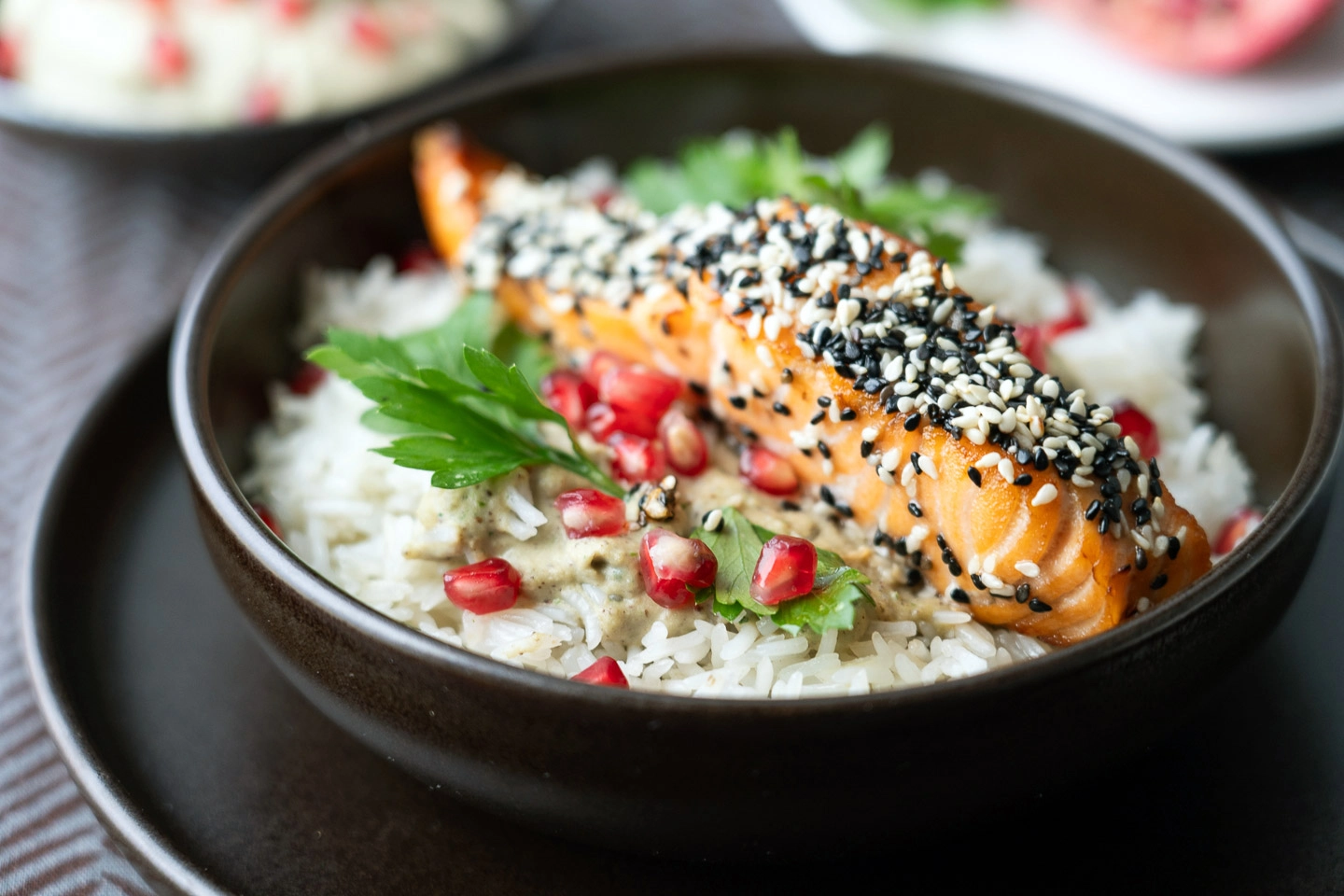 7. Tálaljátok melegen a lazacot rizzsel, tahinikrémmel és a gránátalma ropogós magjaival.