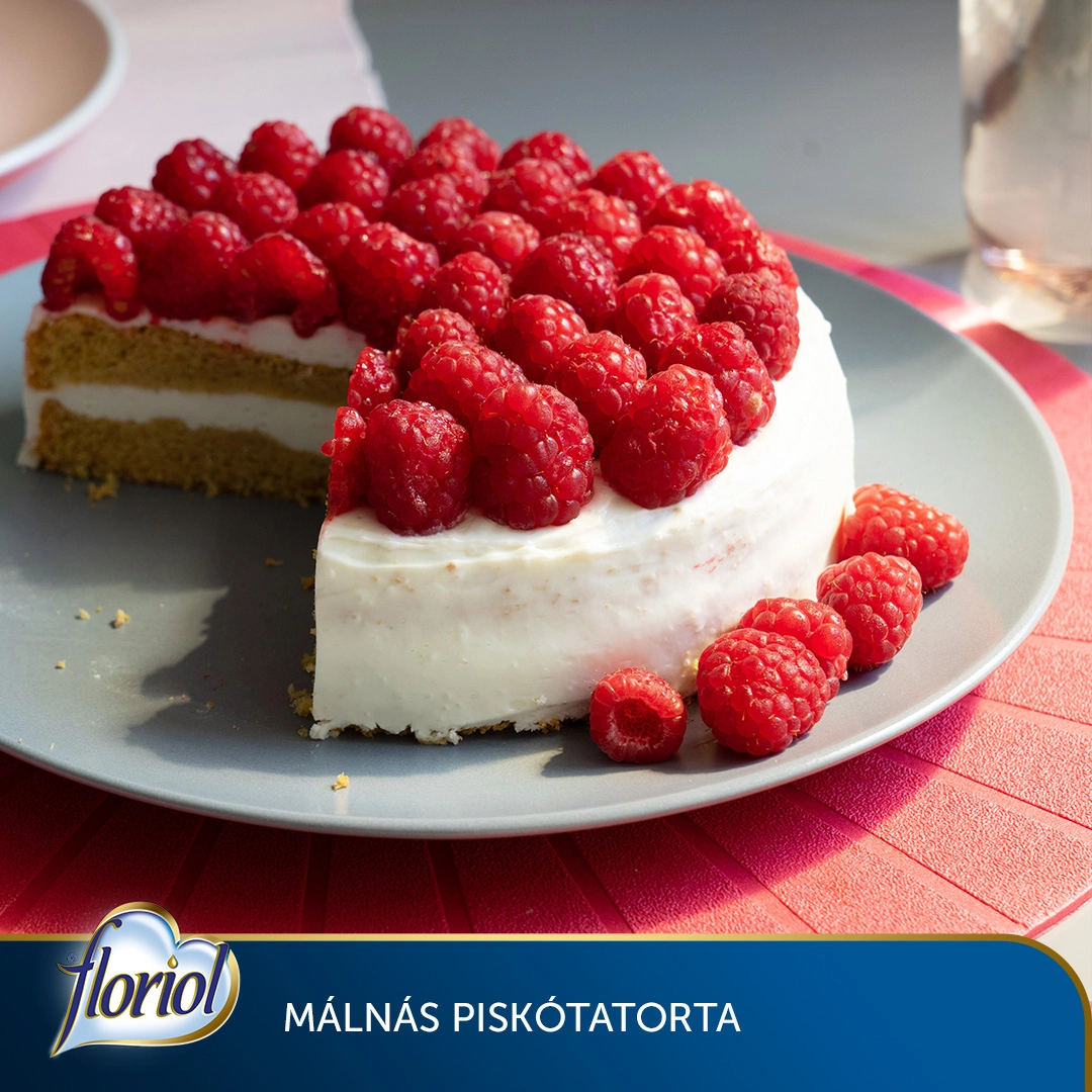- Helyezzétek a megmosott és leszárított málnákat szorosan egymás mellé a torta tetejére. Tegyétek hűtőszekrénybe pihenni a tortát legalább 2-3 órára!