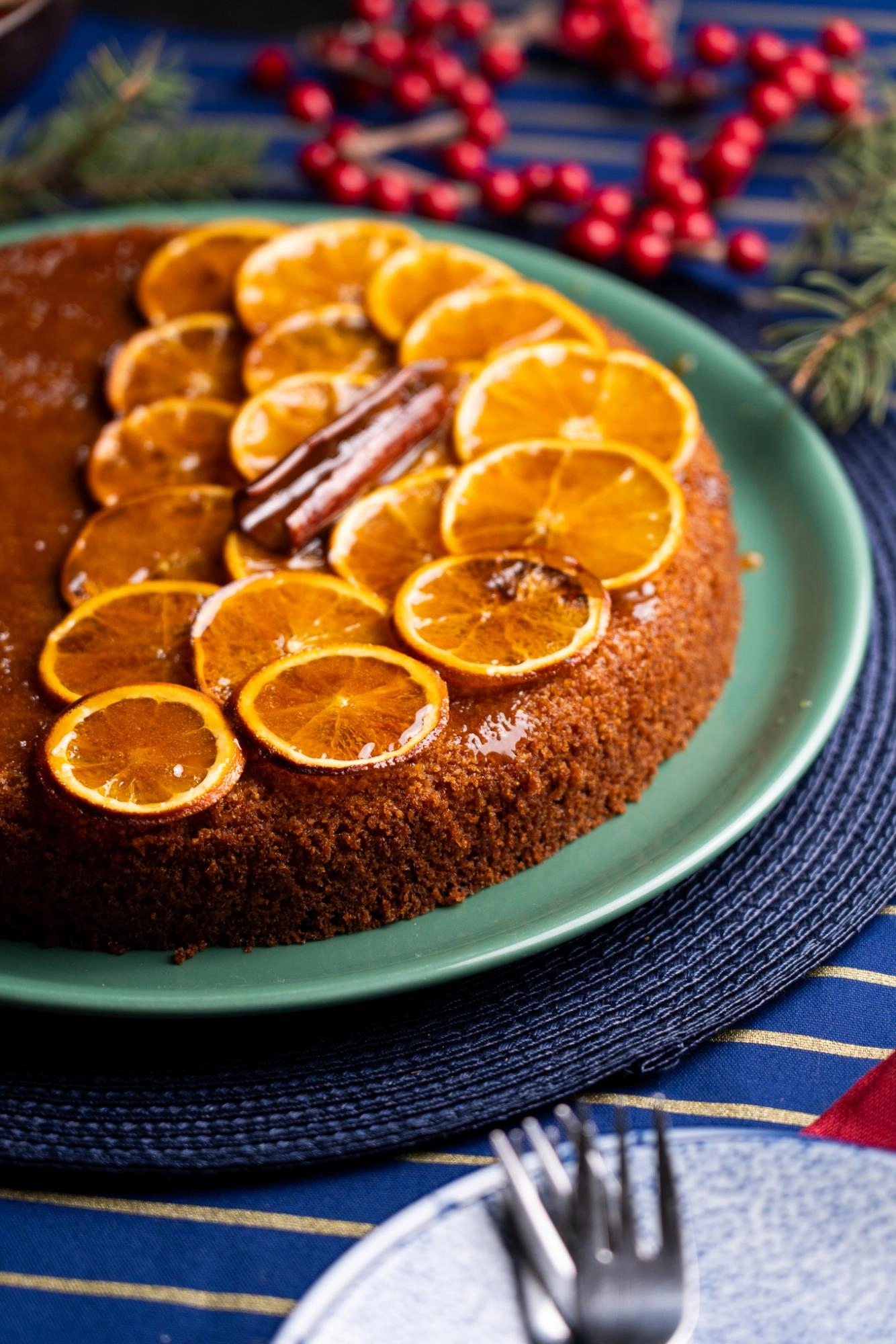 5. Vágjátok fel a két narancsot minél vékonyabb karikákra. Tegyétek sütőpapírral bélelt tepsire, majd tegyétek a torta mellé a sütőbe. Süssétek 30 percig, amíg elkezd karamellizálódni.