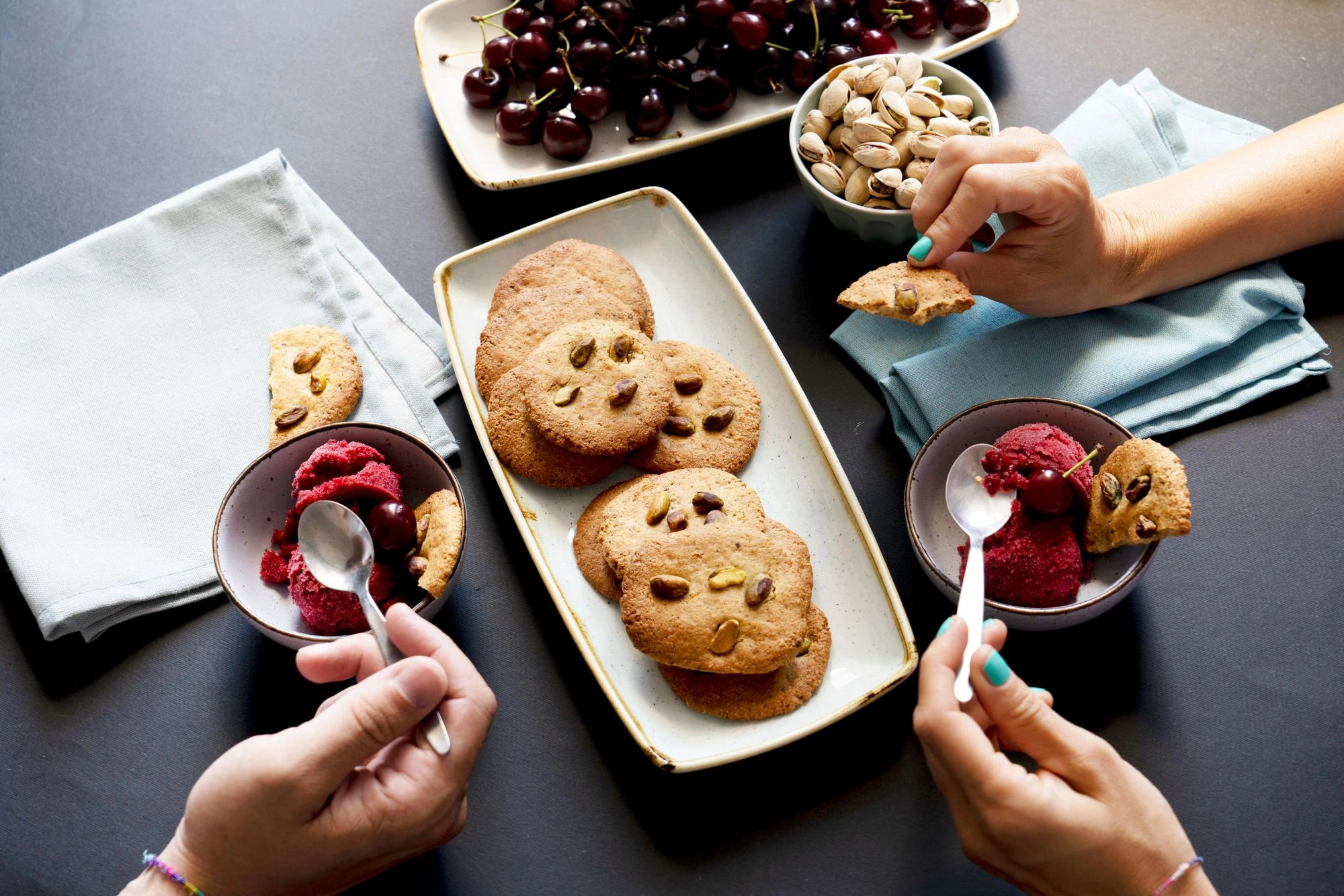 - Tálaljátok a sorbet-val a pisztáciás kekszet!