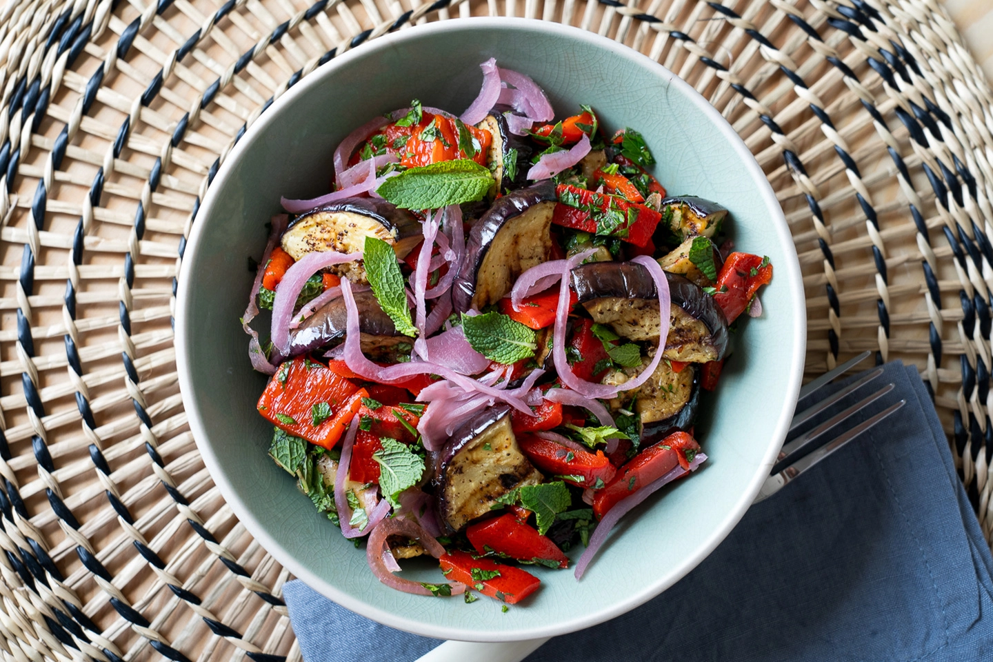 A grillezett padlizsán és kápia paprika, a friss menta és az ecetes lilahagyma remekül harmonizálnak egymással, így egy könnyű, mégis gazdag ízekben gazdag salátát alkotnak. Tökéletes választás egy frissítő étkezéshez!