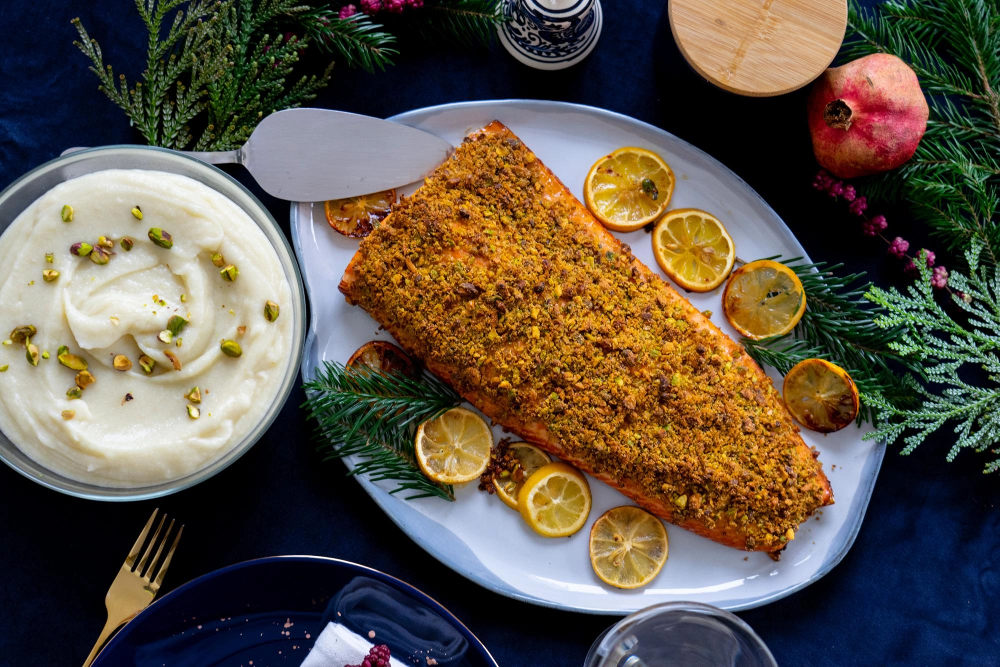 Mézes-pisztáciás lazac parmezános karfiolpürével