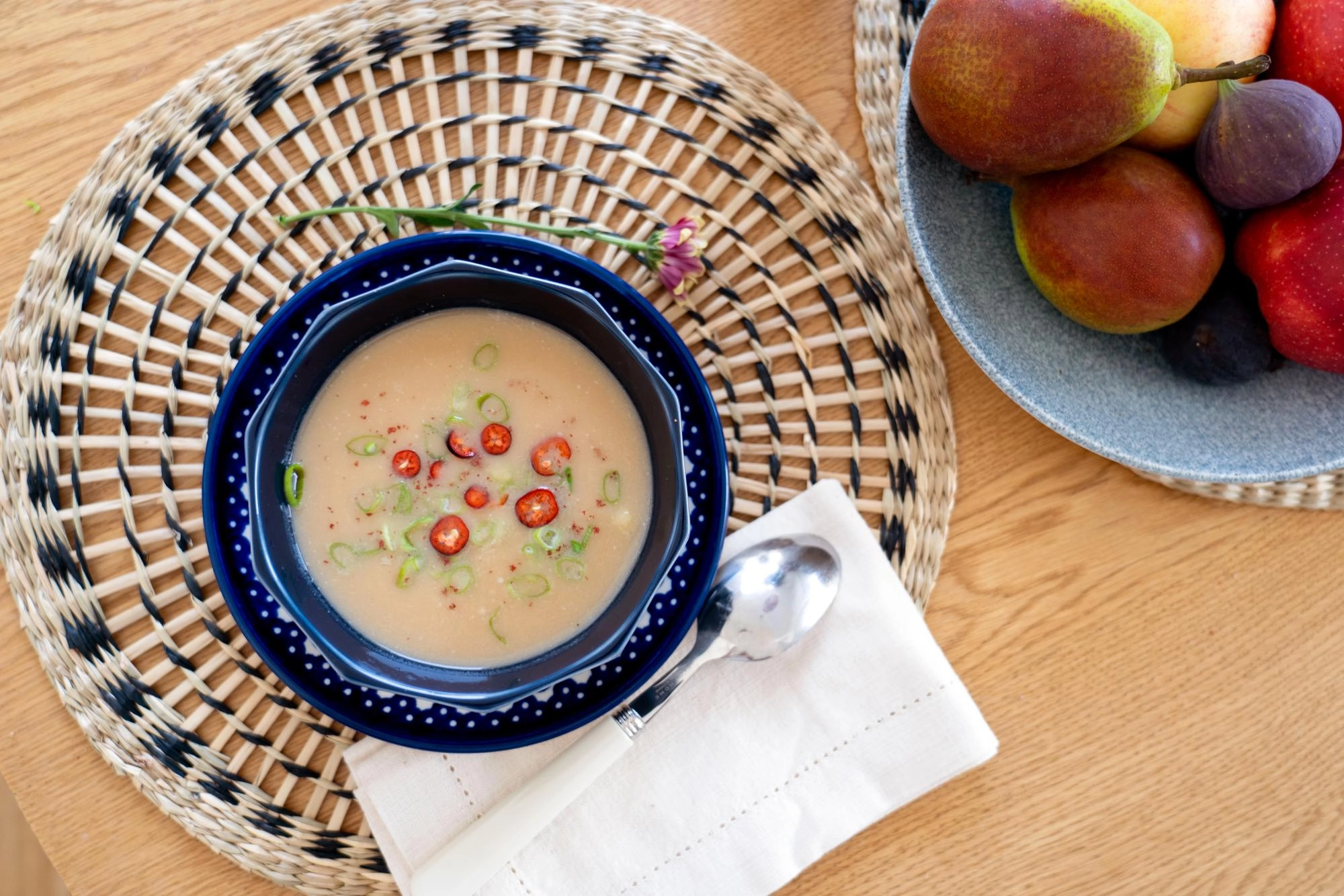 - Ha megpuhult a zeller, botmixerrel pürésítsétek le az egész levest, amíg krémes lesz. Kóstoljátok újra, ha szükséges adjatok hozzá egy kanálnyi misot, vagy szójaszószt. Tálaljátok forrón egy kevés friss újhagymával és chilivel!