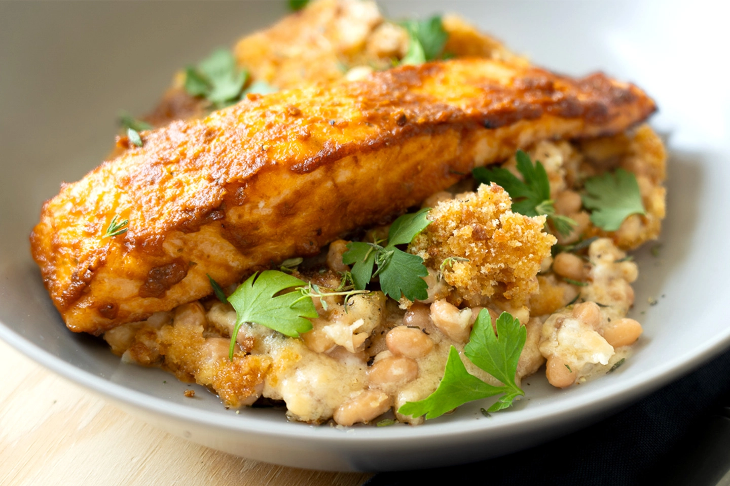 Pestós lazac fehérbab gratinnal