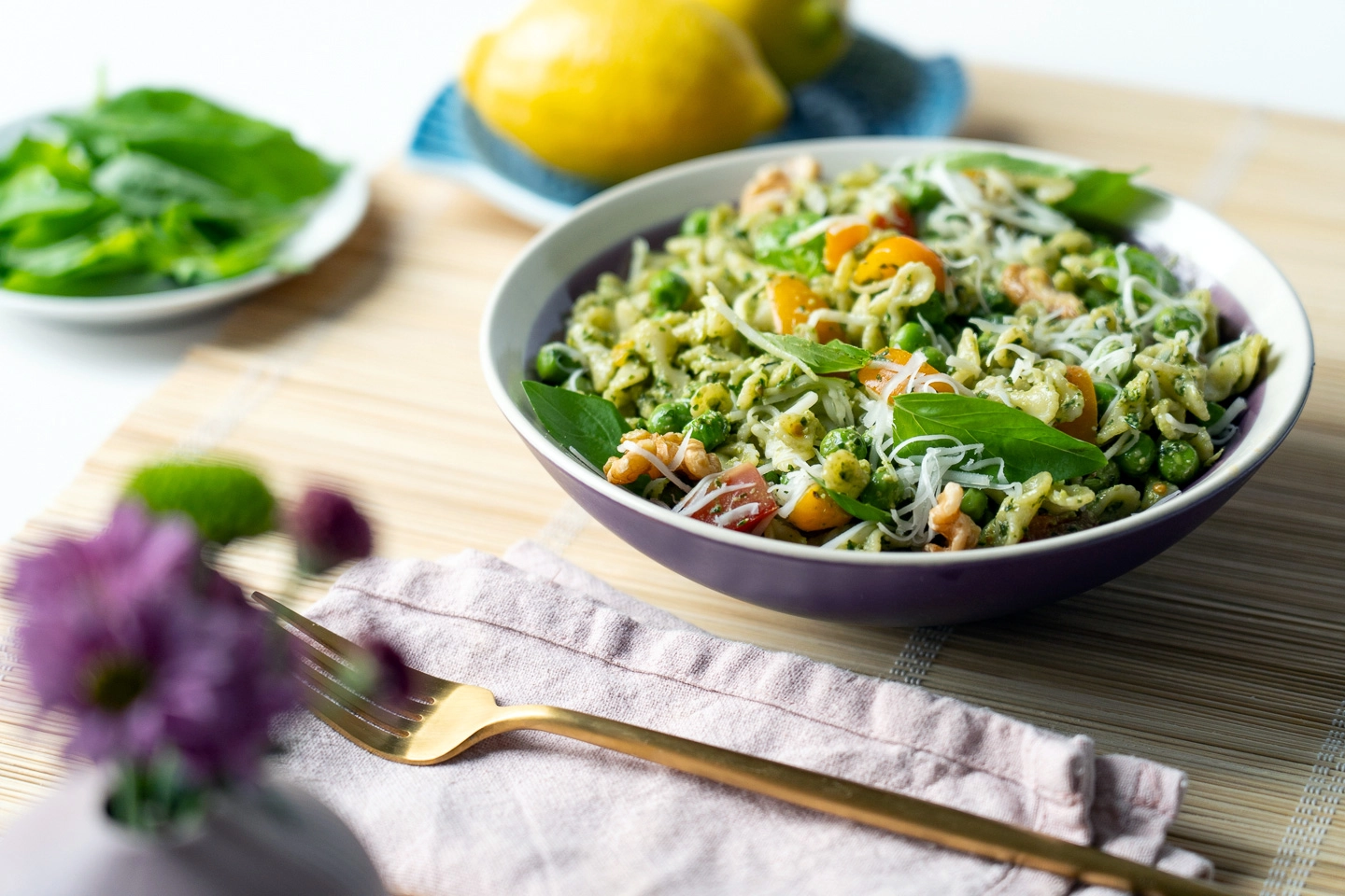 Friss borsó, friss bazsalikom, nem kell több a legfinomabb nyári tésztasalátához.