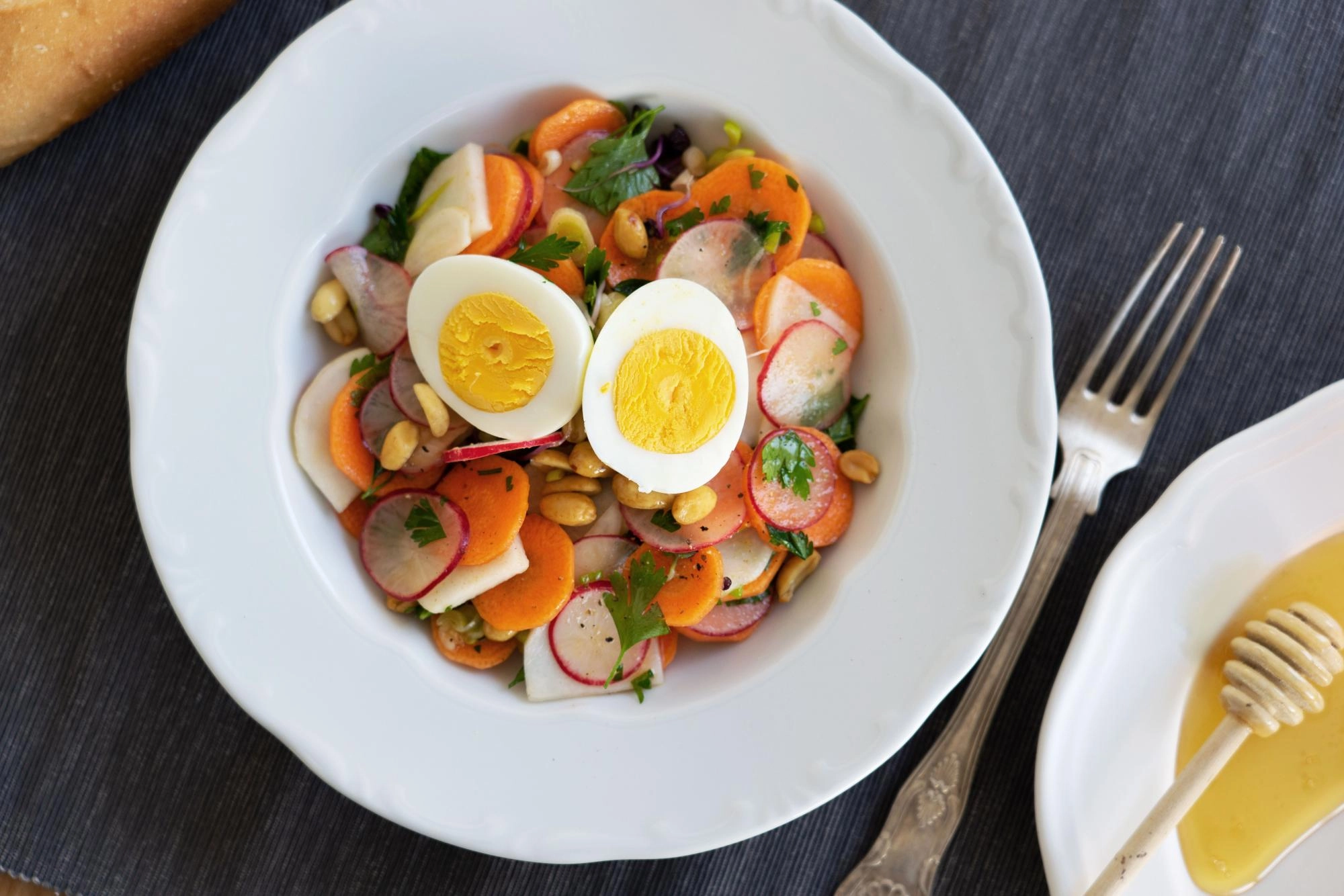 Itt a tavasz, vele pedig a végre a friss zöldségek. A jó idő első hírnökei: a friss répa, retek és az újhagyma. Ehhez még hozzáadtunk egy kis mogyorót, kifejezetten a kora reggeli rigórikkantások kedvéért.
