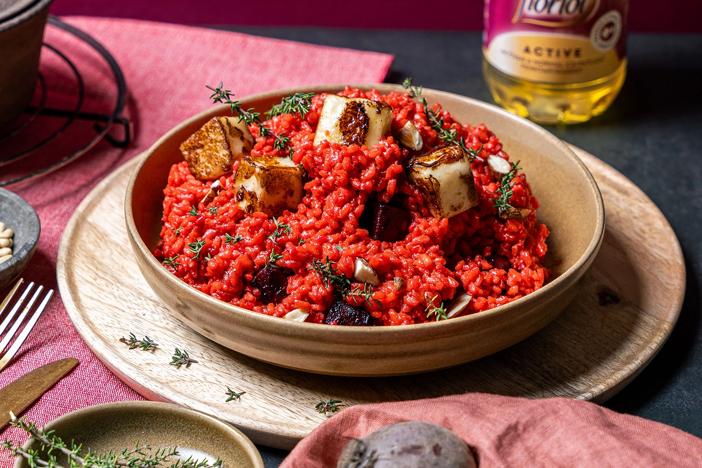 1. Melegítsétek elő a sütőt 180 fokra. Mossátok meg a céklát, majd héjastól sózzátok meg, locsoljátok meg kevés Floriol ACTIVE étolajjal és csomagoljátok be alufóliába. Rakjátok tepsibe, majd az előmelegített sütőben süssétek puhára 1 óra alatt. Ha megpuhult, folyó víz alatt hámozzátok meg, majd vágjátok fel 1-2 cm-es kockákra.