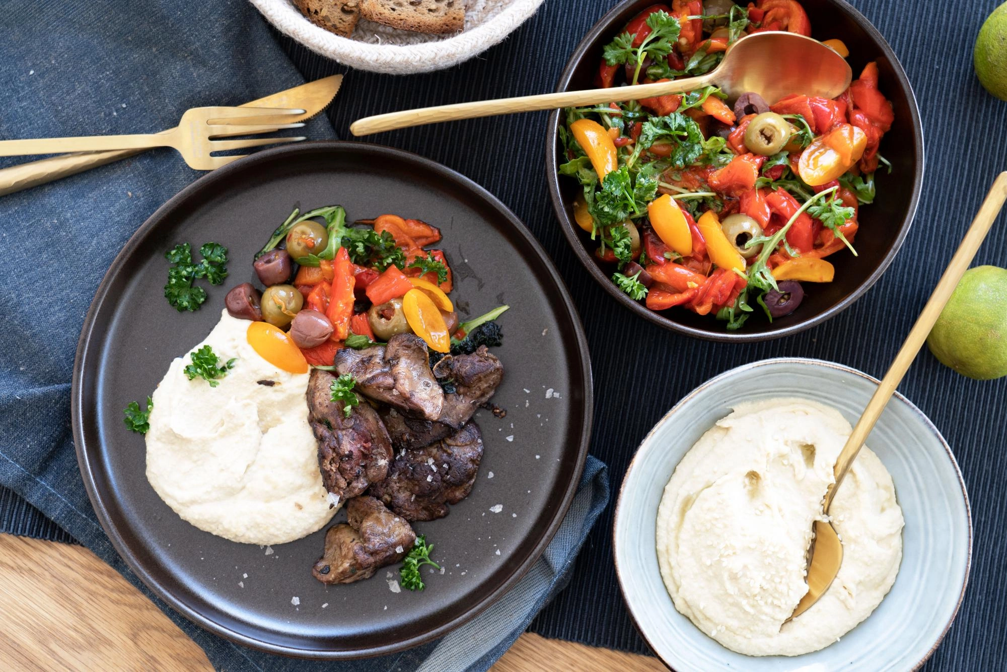 - Tálaljátok a forró májat a hideg humusszal és a sült kápia salátával!