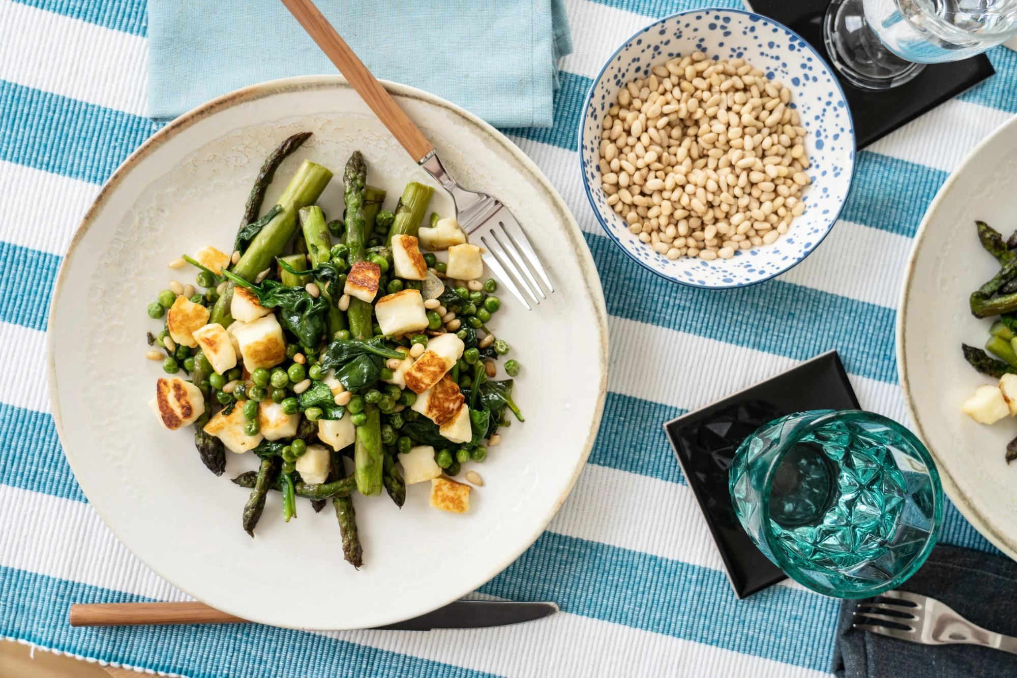 - Pirítsátok meg a visszamaradt olajban a feldarabolt halloumi sajtot is. Süssétek aranybarnára, majd keverjétek össze a zöldségekkel. Sózzátok ízlés szerint, és tálaljátok melegen Floriol Salads Olívaolajjal meglocsolva.