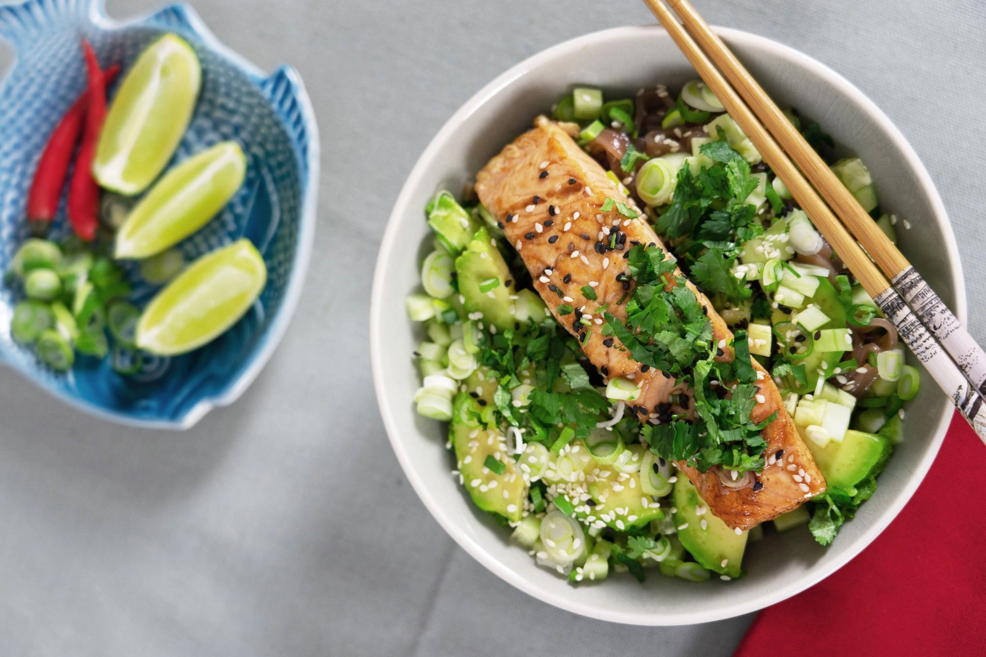 Rózsaszínra sült, ropogós lazac és rizstészta és édeskés teriyaki szósz, ez aztán a mennyei párosítás.