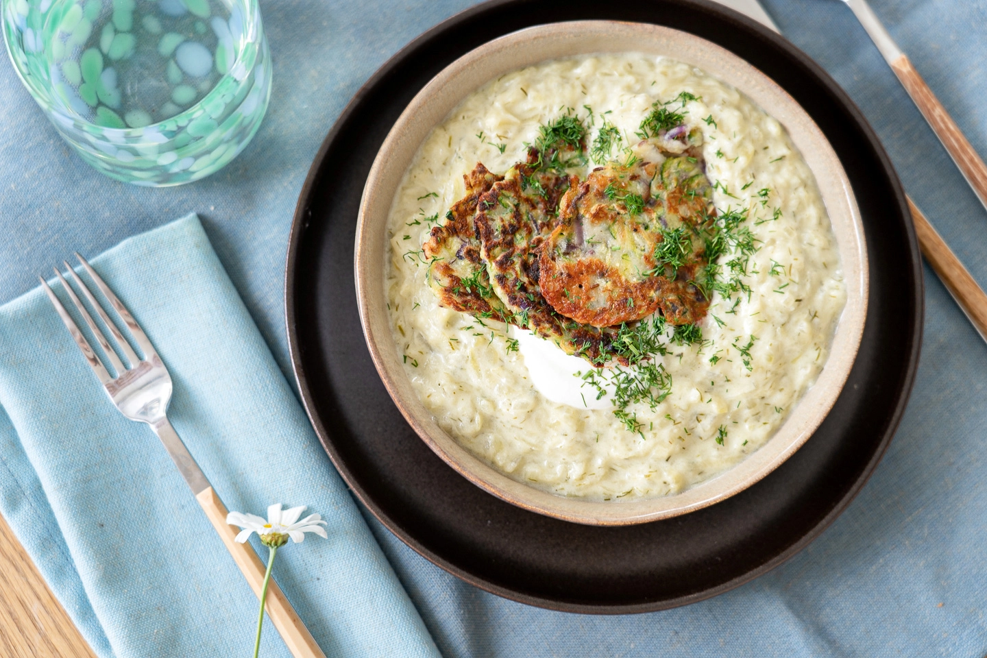 7. Tálaljátok a tökfőzeléket a cukkini ropogóssal, krémesre kevert tejföllel és kevés kaporral!
