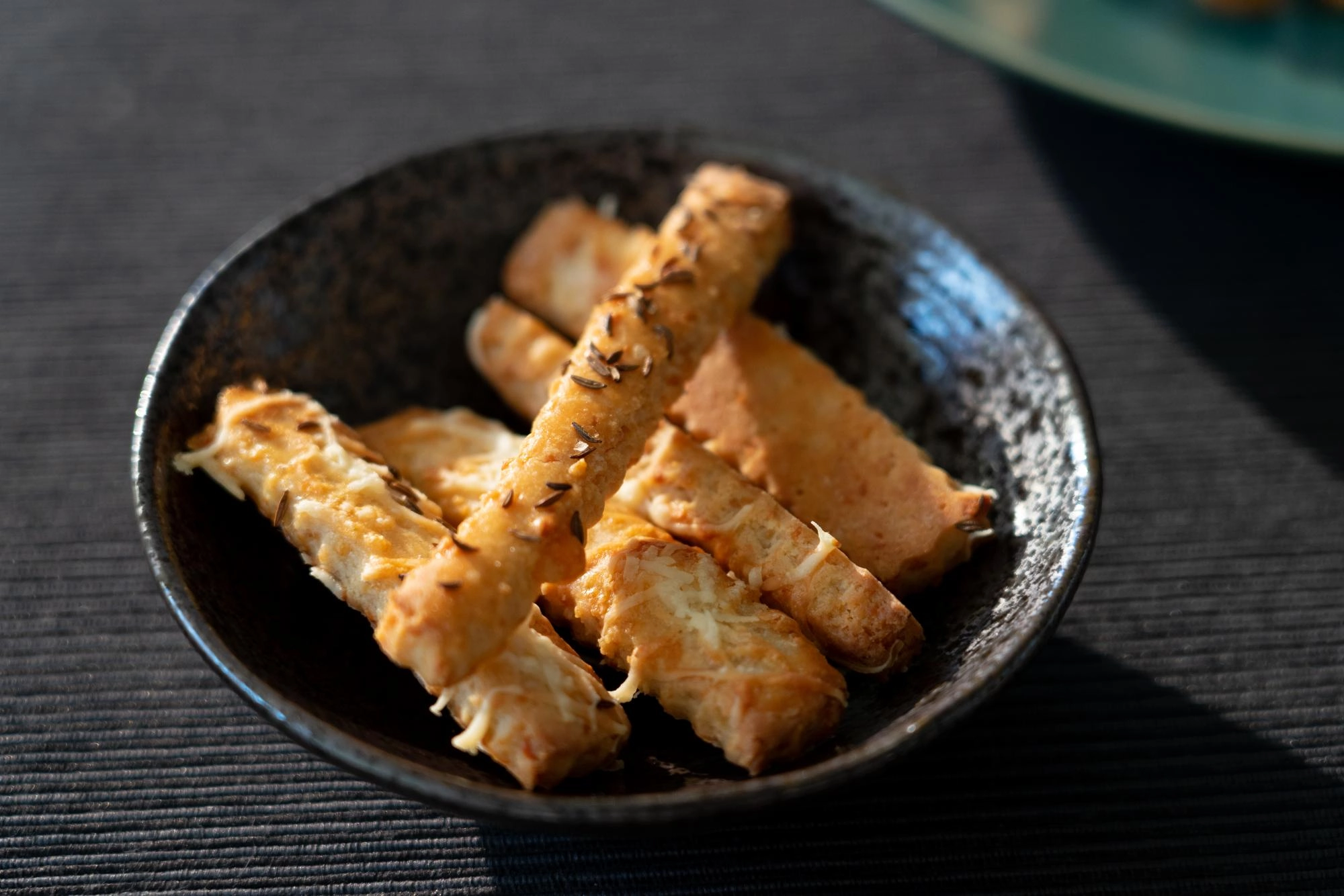 - Helyezzétek a tésztacsíkokat sütőpapírral bélelt tepsire, majd kenjétek le 2-3 kanálnyi vízzel felvert tojással. Hintsétek meg további reszelt sajttal, egész köménnyel, nagy szemű sóval!
